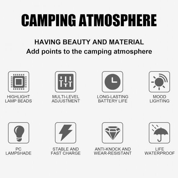 - ◒ Gancho manija: esta bombilla luz para acampar también se pueusar como luces cama y luces nocturnas, como en botes pesca, camiones y campamentos. Es fácil transportar y colgar, adecuado para actividades al aire libre.