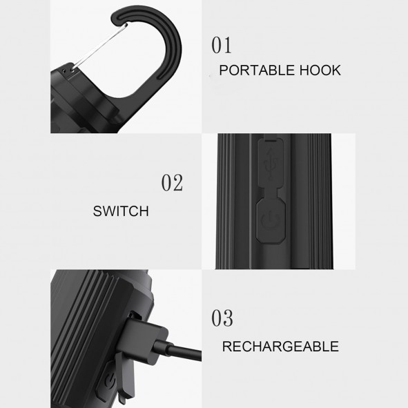 - ◒ Material ABS: material ABS, esta bombilla recargable USB es anticaída y tiene buena resistencia a los impactos. No es fácil dañar y deformar, y tiene resistencia al desgaste.