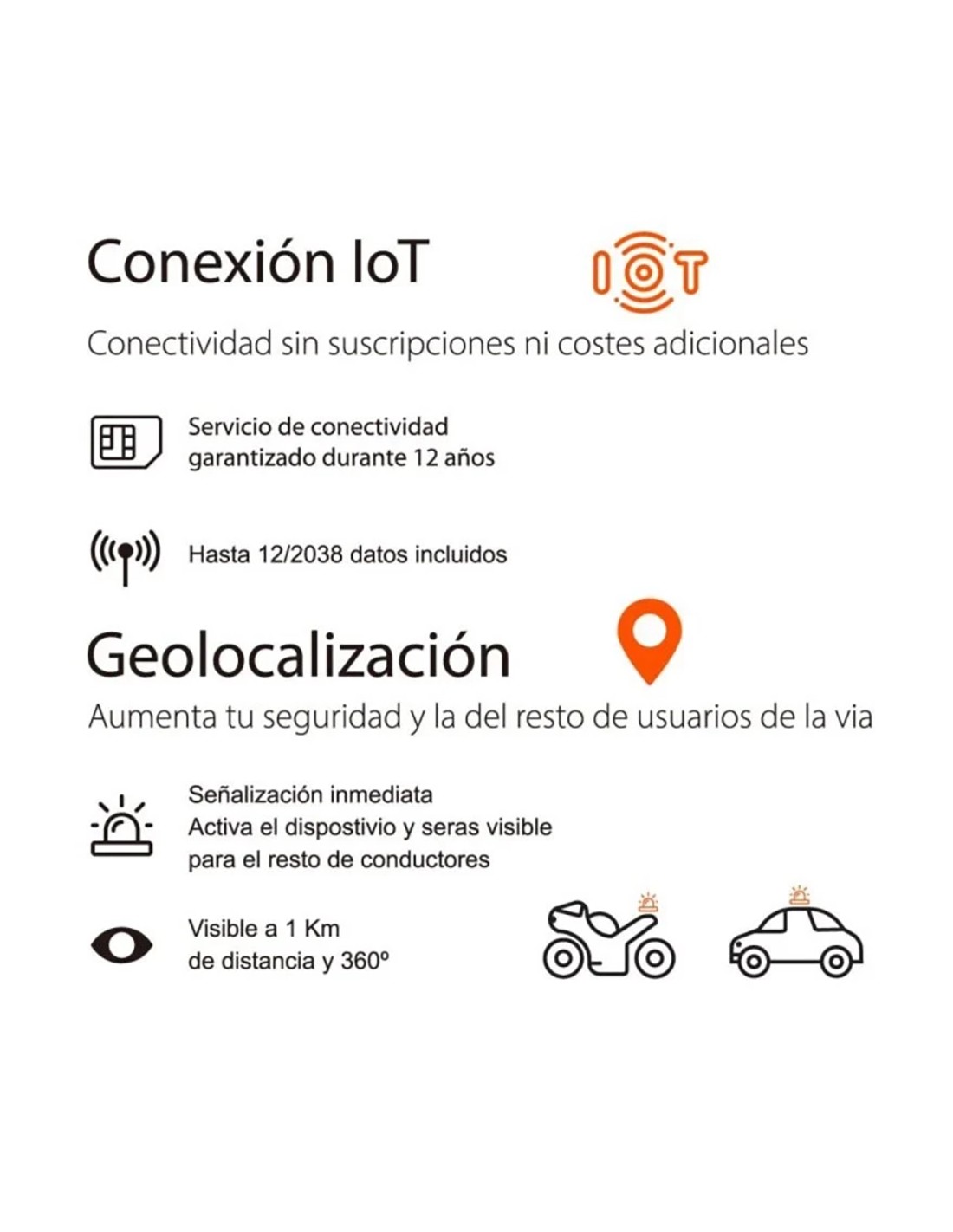Geolocalización IoT integrada: Envía la posición del vehículo al sistema DGT 3.0, conectividad IoT GSM, SIM integrada, datos incluidos hasta 12/2038, aumentando la seguridad vial.